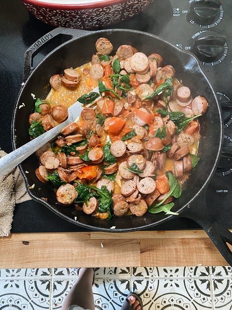 Dutch’s Pasta! A crowd favorite here that she introduced to us at New Years. It’s a delicious example of a few ingredients coming together for a simmeringly tasty dish: chicken sausage, butter, white wine, tomatoes, garlic, fresh spinach. All of this over pasta. Yum.